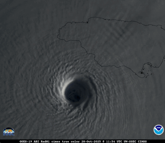 Durante la fase de rápida intensificación de Melissa, las imágenes satelitales mostraron claramente estas características mientras la presión central de la tormenta se desplomaba a 892 hPa, convirtiéndola en el tercer huracán más intenso jamás observado en el Caribe.