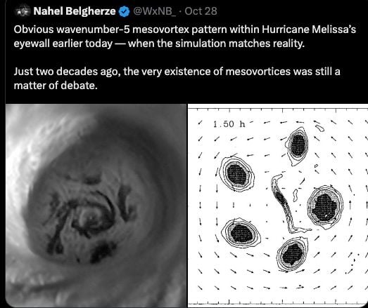 Unas de las imágenes que se han hecho viral en las redes sociales y entre los científicos han sido la presencia nítida de mesovórtices dentro del ojo del huracán Melissa cuando alcanzaba su máxima intensidad de categoría 5 y vientos sostenidos del orden de 295 km/h al sur de Jamaica.
