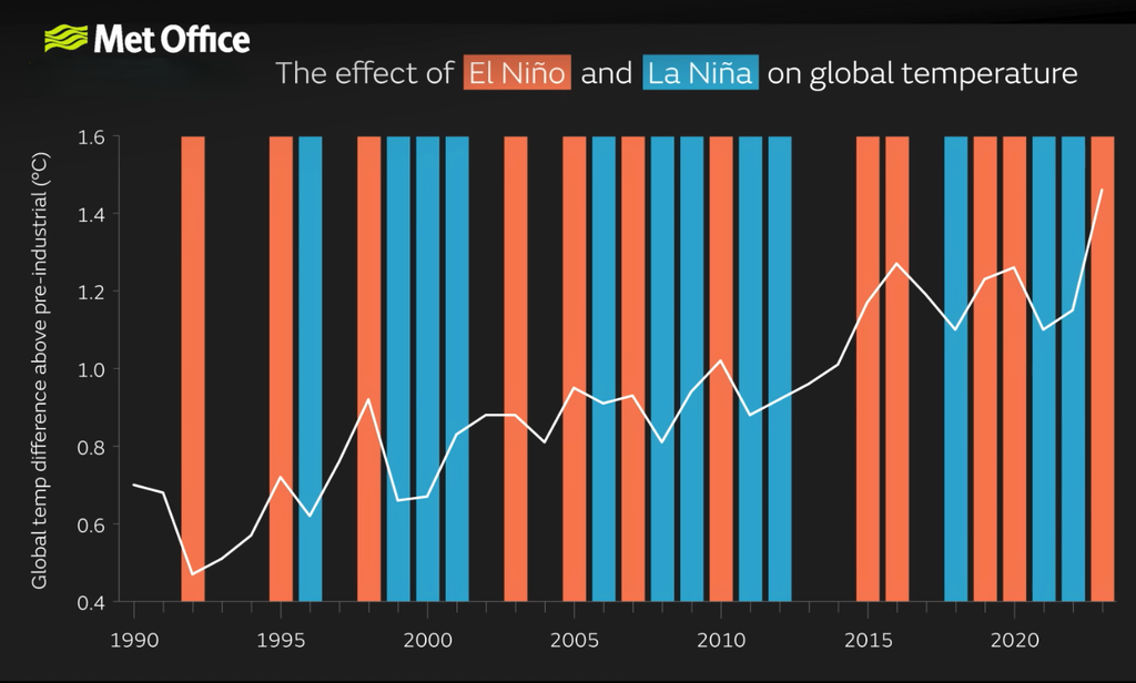 Grahame continuó: “Un fenómeno de El Niño aporta calor a la atmósfera y, por lo general, eleva la temperatura media global en aproximadamente una quinta parte de grado Celsius. 1998 fue un año significativo para la temperatura global y, en ese momento, fue el año más cálido registrado, y El Niño contribuyó al aumento de las temperaturas”.