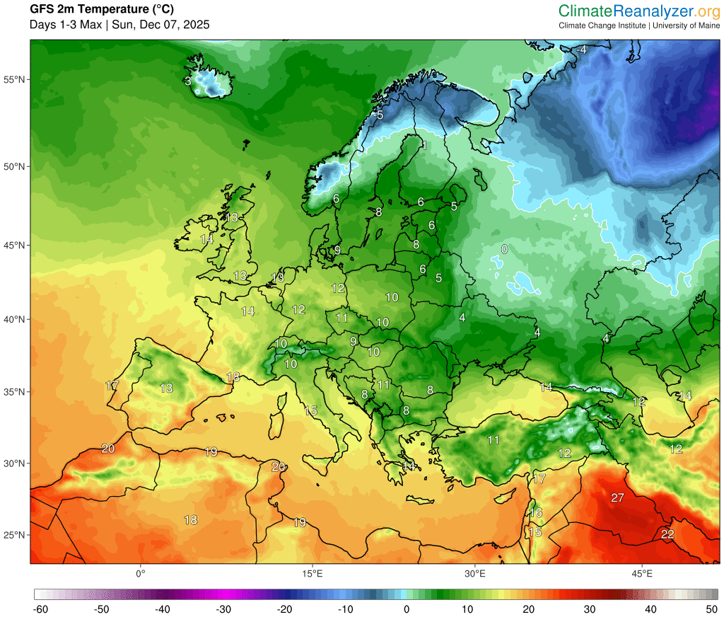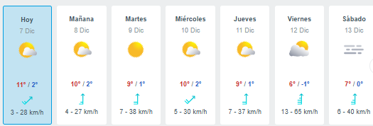 Se espera que para la segunda parte del martes, 9 de diciembre, un frente frío entre por el oeste, aunque se debilitará durante el miércoles y jueves cuando se traslade hacia el este. Posteriormente, una nueva dorsal de estabilidad hará que las temperaturas bajen, especialmente las mínimas.