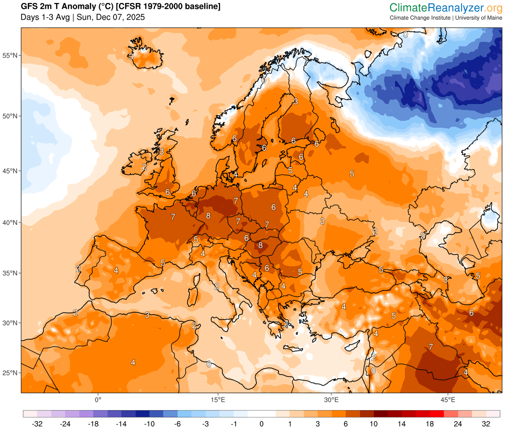La situación anticiclónica con cielos despejados o vientos de componente sur-suroeste hará que las temperaturas suban entre el domingo 7 y el martes 9 de diciembre.