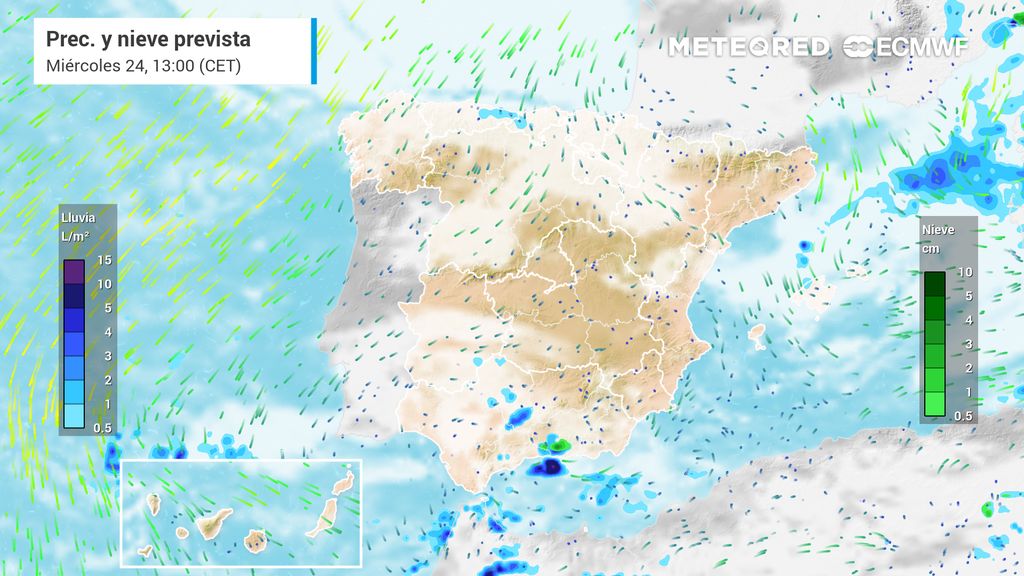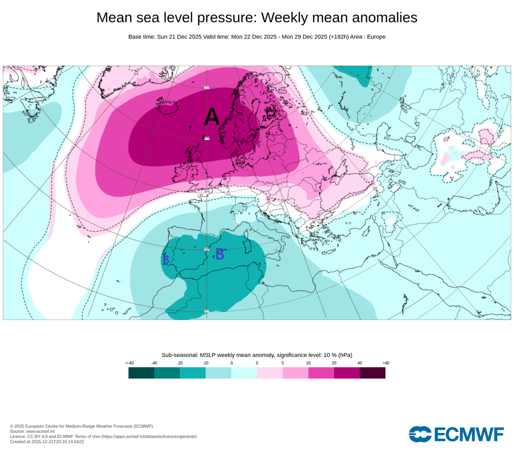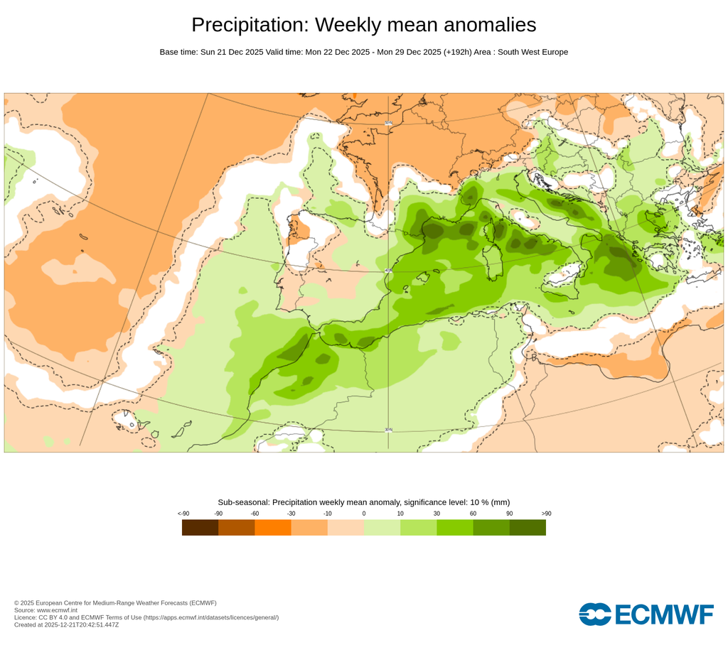 La semana del 22 al 28 de diciembre de 2025 continuará el ambiente más frío de lo normal con descensos de temperaturas y heladas nocturnas. Lloverá en amplias áreas peninsulares y la nieve aparecerá tanto en las zonas de montaña como en otras áreas más bajas.