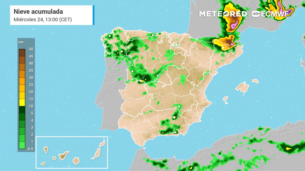 La nieve hará acto de presencia en zonas de los Pirineos, preferentemente en su vertiente oriental y en zonas algo más bajas del noreste. Podría nevar en zonas altas del sistema cantábrico.