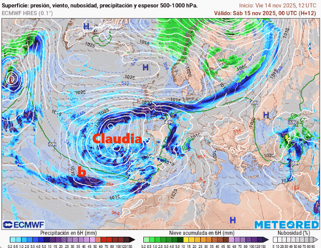 Para el sábado 15 de noviembre de 2025, un sistema de bajas presiones, b, con fuerte inestabilidad y tormentas y procedente desde el centro del Atlántico Norte subtropical, será captado por la borrasca Claudia, reforzando las precipitaciones y tormentas para dicho día y obligando a activar los avisos naranjas con otro pulso de tiempo adverso.