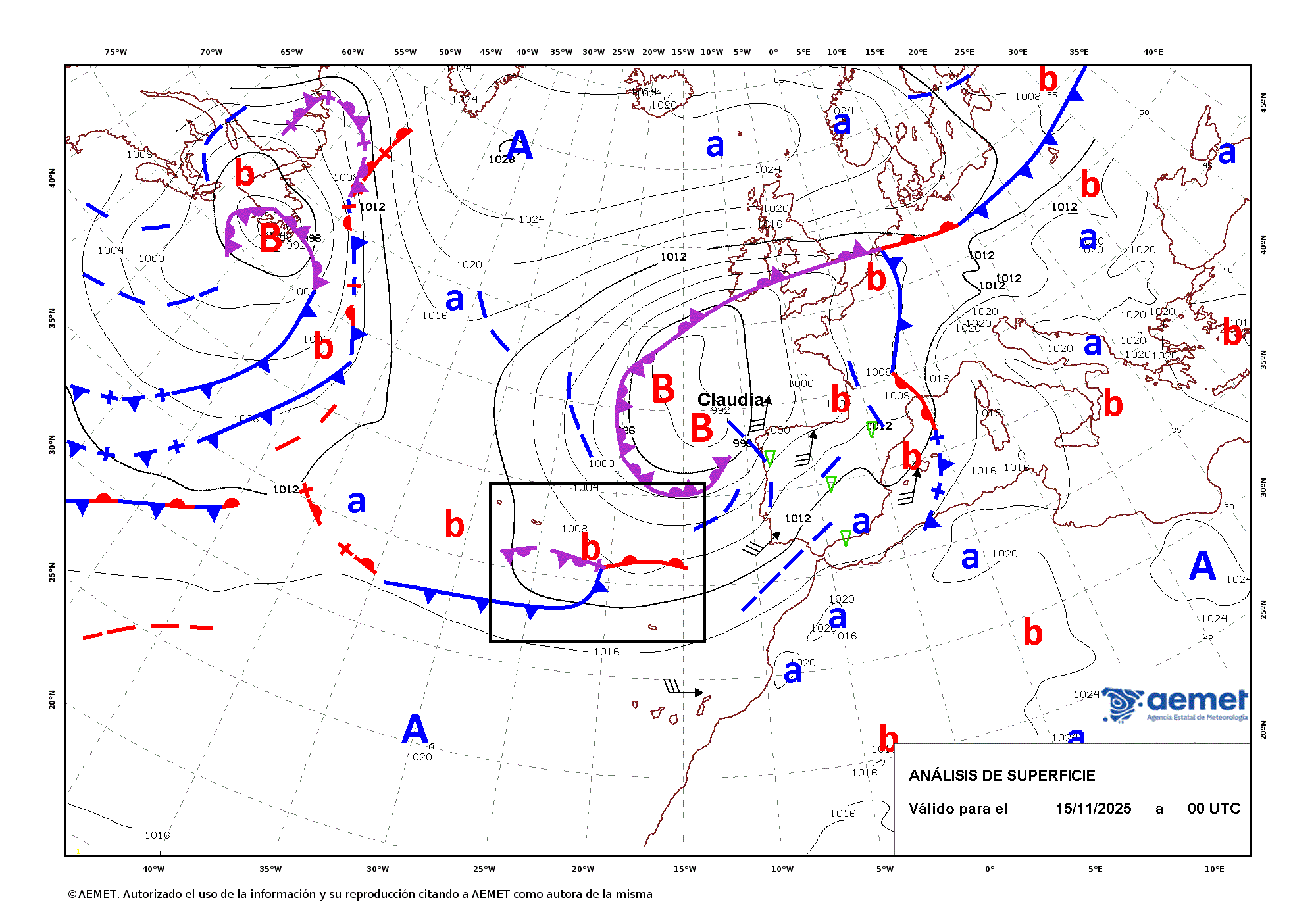 Durante la noche del viernes al sábado y especialmente a lo largo de este día, 15 de noviembre, una zona de bajas presiones, b, se ha desplazado desde Azores hacia el suroeste de la Península conducida por vientos intensos en altura. Durante la noche, se ha acercado a la Península intensificándose. Para hoy sábado por la mañana, se prevé que llegue al sur de Portugal entrando bajo el radio de acción de la borrasca Claudia.