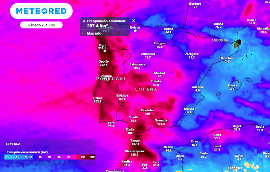 Se prevén acumualciones hasta el viernes 7 de febrero del orden de 100-200 l/m2 y de hasta 300 l/m2 o más en zonas del oeste y sur peninsular, siendo optimistas.