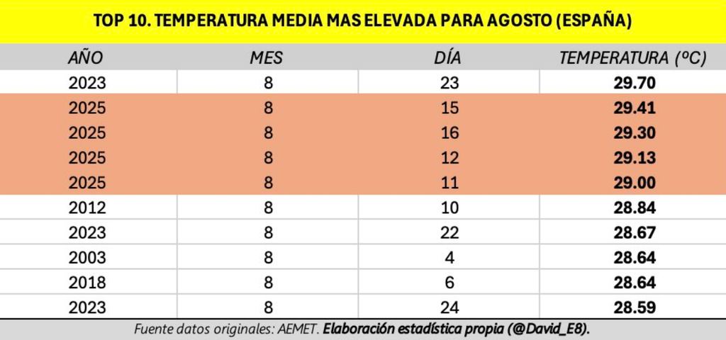 El experto climatólogo César Rodríguez Ballesteros ya se hacía eco de estos hechos, a mediados de mes, cuando los días 11 y 12 de agosto de 2025 marcaron récords de temperaturas máximas y apuntaba en un tuit de X: "Cuando finalice este episodio, actualizaré mi entrada con los diez días más calurosos en España desde 1941, pero ya os adelanto, que ayer, 11 de agosto, con una temperatura máxima a nivel nacional de 37,53 °C, ocupa la tercera posición".