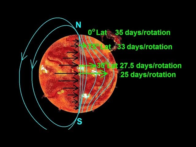El Sol gira sobre su eje, pero no se comporta como una esfera giratoria sólida. En cambio, debido a que está hecho de plasma caliente e ionizado, diferentes partes del Sol giran a diferentes velocidades.
