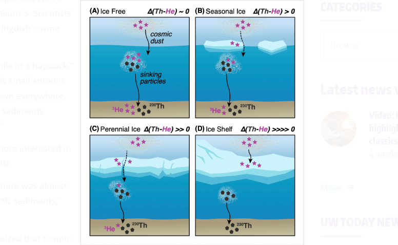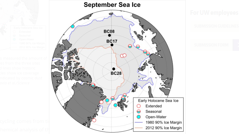 Los investigadores plantearon la hipótesis de que el polvo cósmico podría servir como indicador del hielo antes de que existieran satélites para monitorear los cambios en la cobertura. El hielo en la superficie del mar impide que el polvo cósmico llegue al fondo marino, mientras que las aguas abiertas permiten que el polvo cósmico se deposite en los sedimentos. Mediante el análisis de la cantidad de polvo cósmico en núcleos de sedimentos de tres sitios, los investigadores reconstruyeron la historia del hielo marino durante los últimos 30.000 años.