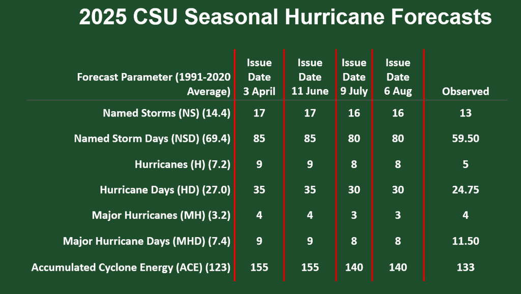 Los pronósticos estacionales para la ACE (*), Accumulated Cyclone Energy, se cumplieron con precisión, mientras que otros parámetros se sobreestimaron o subestimaron debido a la distribución inusual de tormentas tropicales de este año.
