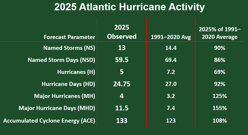 La temporada de huracanes de 2025 fue oficialmente superior a lo normal según la definición de ACE de la NOAA (126,2–159,6 ACE). Los huracanes mayores, los días con huracanes mayores, la ACE y el NTC se situaron ligeramente por encima de sus promedios históricos, mientras que otros indicadores se situaron ligeramente por debajo.