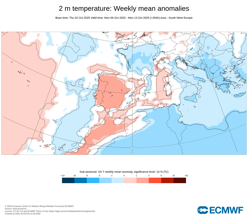 La primera semana completa de octubre de 2025 será, en general, más cálida y seca de lo normal en amplias zonas de España, según las tendencias medias de la semana mostradas en los mapas siguientes.