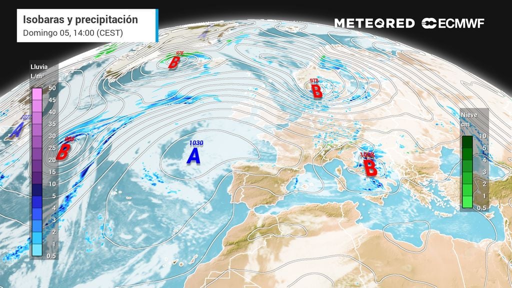 Las temperaturas serán más altas de lo normal en casi toda España, salvo en el norte. Con la llegada del frente frío ligado a Amy, las temperaturas bajarán el sábado en el tercio norte y permanecerán más altas de lo normal en el resto de España. Para el domingo 5, las temperaturas seguirán bajando por el norte y se extenderán por el este y Baleares, y seguirán más altas en el resto de España. El contraste térmico norte-sur en la Península será muy alto, con máximas de 35 ºC por el sur y 20 ºC de máximas por el norte.