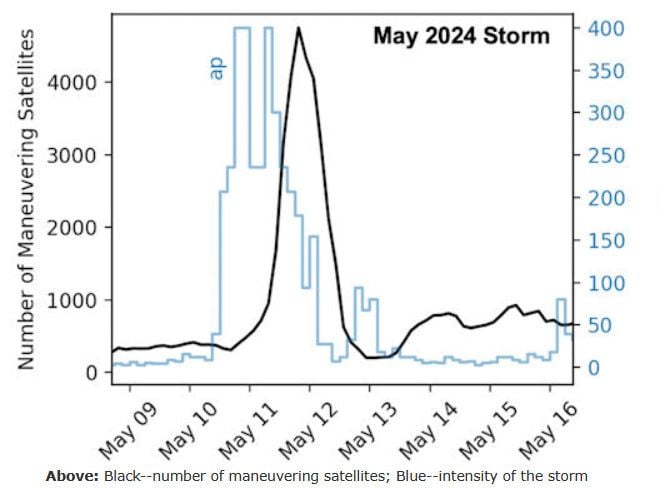 Ese escenario no es hipotético. Durante la supertormenta geomagnética del 10 al 11 de mayo de 2024, más de 5000 satélites realizaron maniobras de emergencia para mantener sus órbitas ( historia completa ). La mayoría eran Starlinks. La incertidumbre sobre la posición aumentó a kilómetros, exactamente el tipo de perturbación prevista por el Reloj CRASH. Afortunadamente, la tormenta amainó antes de que se produjera una colisión importante.