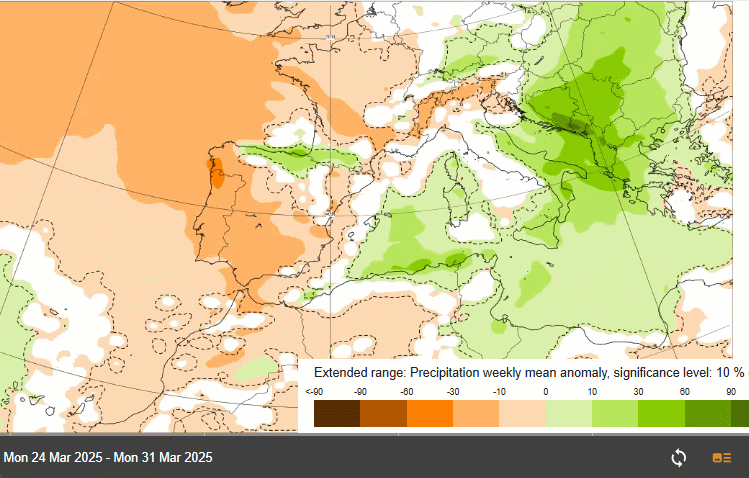 Según las últimas predicciones semanales de las anomalías de precipitación, se espera que el final de marzo e inicio de abril de 2025 serán más secos de lo normal, como se observan en esta secuencia.