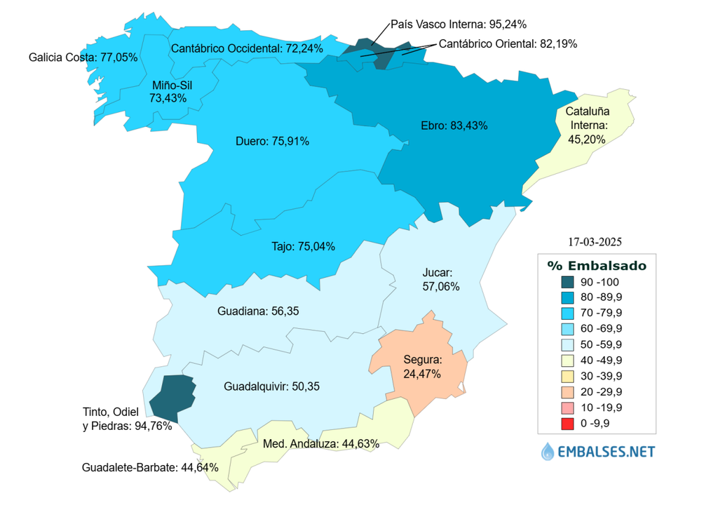 Evolución temporal del agua embalsada en a Península para 2025, en rojo, con respecto a otros periodos referenciados en la gráfica. Embalses.netPorcentaje de agua embalsada por cuencas a fecha de 17 de marzo de 2025. Embalses.net