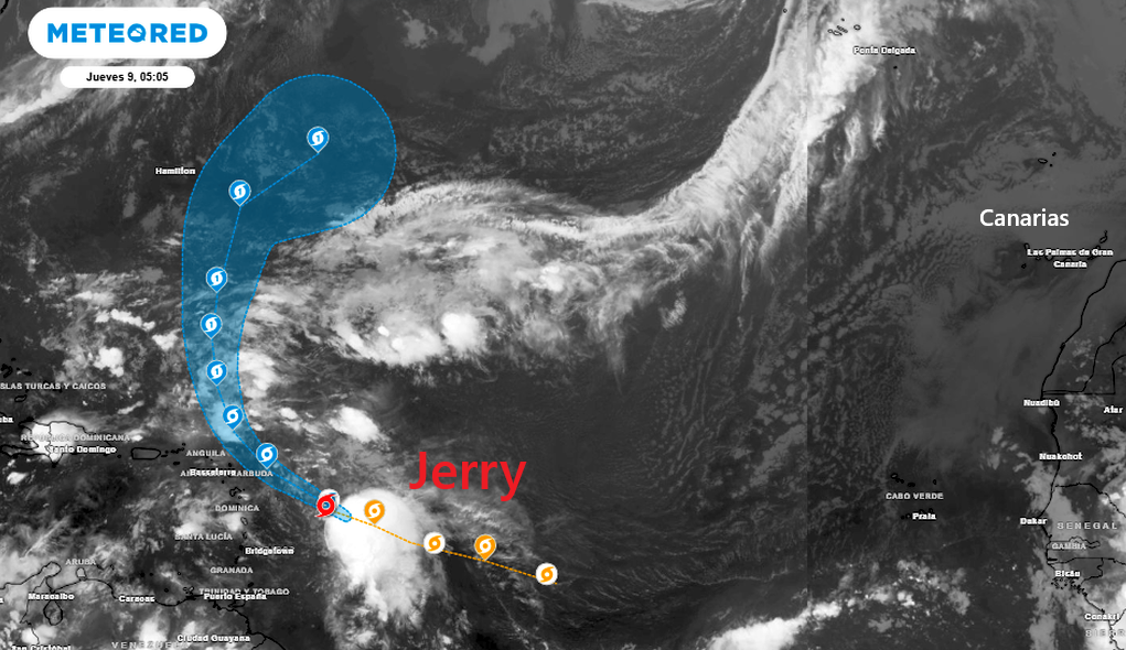 Según el NHC, la tormenta tropical Jerry está afectando actualmente a las islas de Barlovento en la zona occidental tropical del Atlántico. Podría ser huracán de categoría 1, y tal vez 2, para el sábado 11 de octubre con las predicciones actuales. Más tarde, el huracán podría recurvar hacia el Atlántico central camino del sur de las Azores.