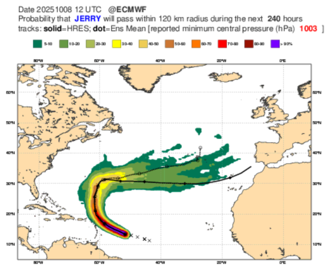 Las predicciones probabilísticas apuntan a que en la primera mitad de la semana venidera, 13-19, los restos de Jerry podrían pasar a ser una borrasca extratropical, ex-Jerry.