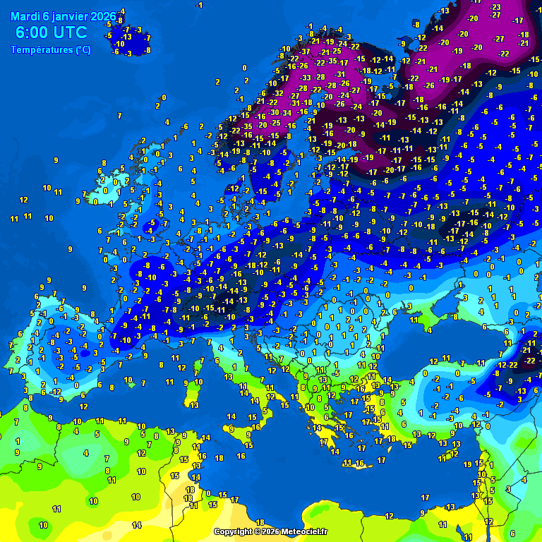 Esto se debía a que Europa estaba sufriendo una entrada gélida donde las temperaturas bajaban a los -10 ºC en las mínimas. En algunos lugares de Hungría podrían caer a los -20 °C, mientras que en Suiza y Austria las mínimas se desplomaban a los -24 °C en los Alpes durante la noche.
