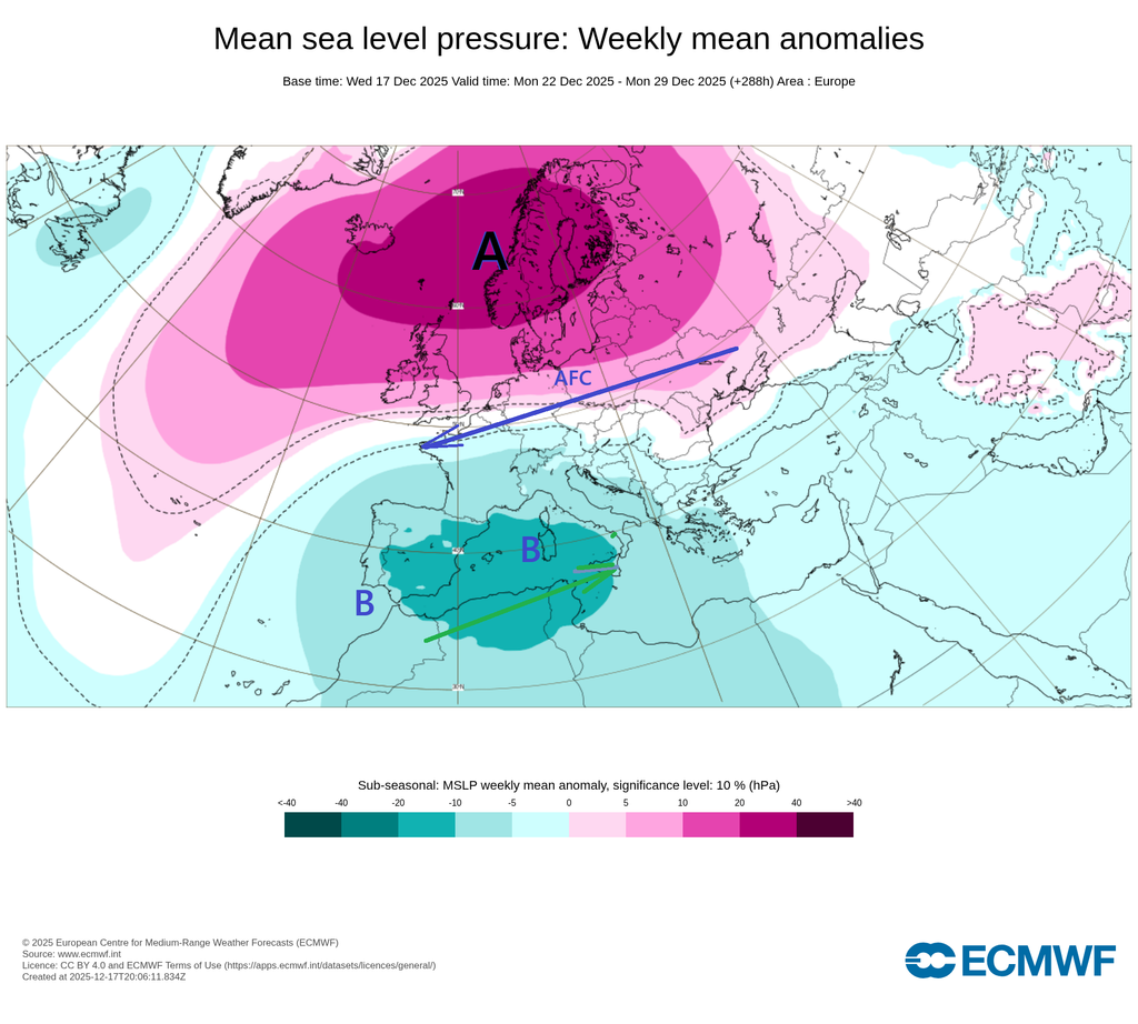 - Un potente anticiclón de bloqueo escandinavo, A, cuyo eje estará orientado de oeste a este.
