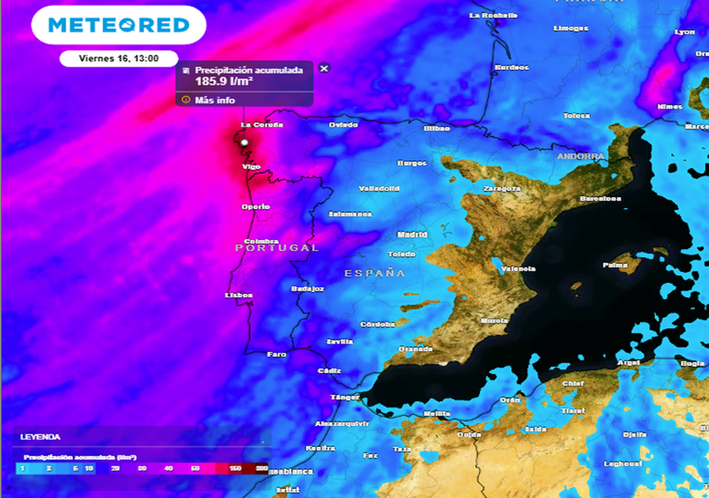Para el martes 13, el frente frío aludido ya afectaría a toda la fachada occidental peninsular, desde Galicia a Andalucía, pasando por el oeste de Castilla y León y Extremadura. Canarias también se vería afectada por las lluvias frontales de este largo sistema frontal. Se podría generar mala mar en las costas gallegas, donde las acumulaciones de precipitación serían de nuevo importantes. Nieve en zonas altas de montaña.