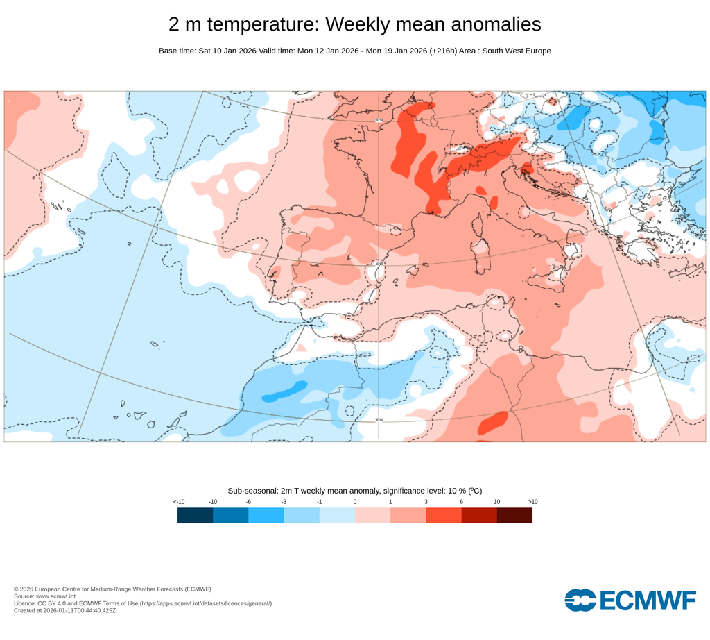 Con estas ideas, es probable que la estabilidad se imponga el lunes 12 en gran parte de España con heladas ligeras en el interior, nubes bajas y algunas nieblas, mientras que por el noroeste entraría un frente cálido poco activo que elevaría las temperaturas en la zona. El frente afectaría a Galicia y zonas del extremo norte occidental y central. Tras él vendría ya un nuevo frente frío más activo.