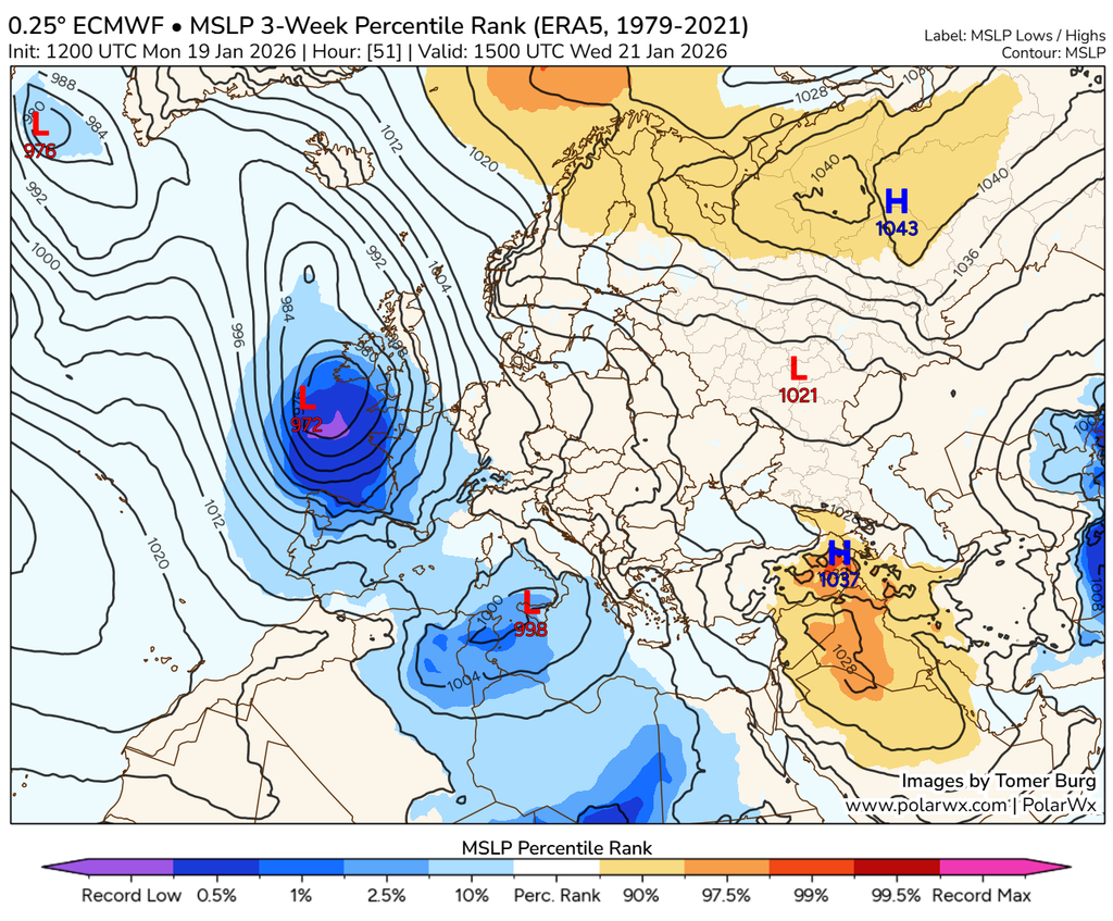 El chorro polar, muy intenso y de baja latitud, va a generar borrascas muy poderosas y de alto impacto en la fachada occidental de Europa con sucesivos y continuos temporales muy duros. Al menos una de estas borrascas podría ser nombrada, Ingrid (si lo hace algún SMN del suroeste de Europa).