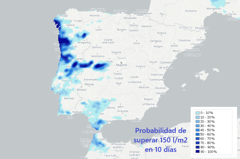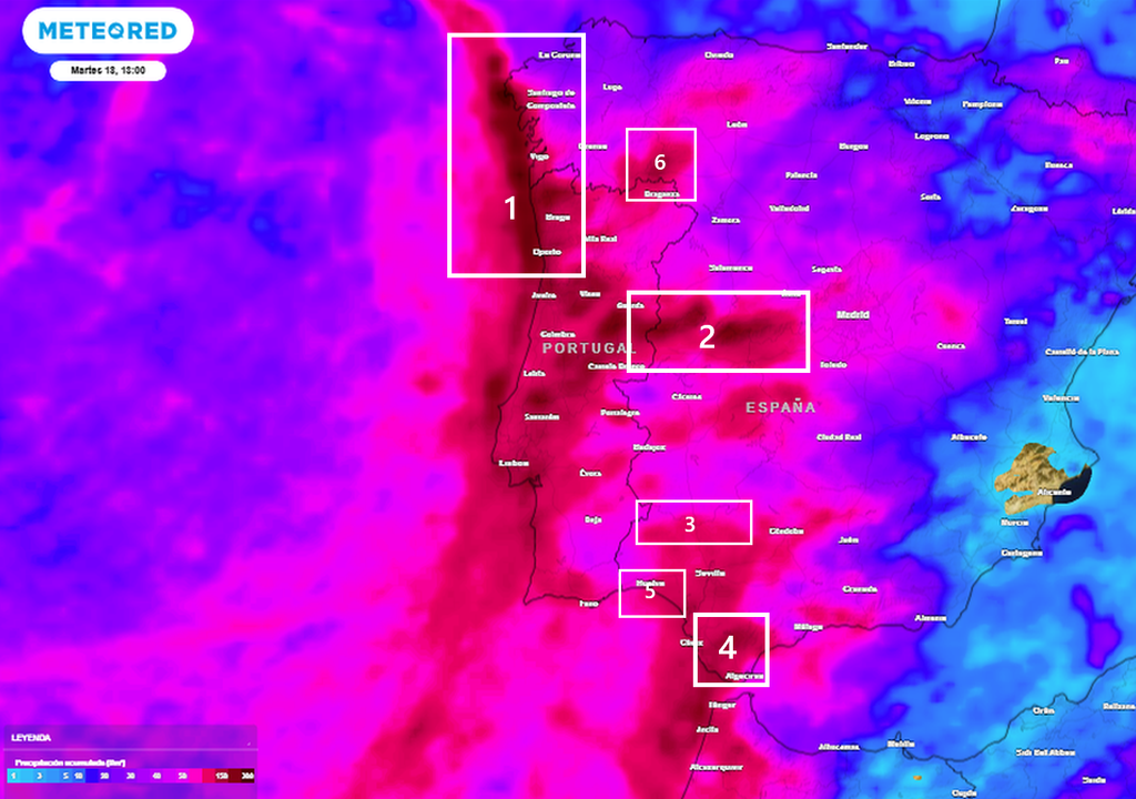 En estas circunstancias, los vientos llovedores y suaves dejarán máximos de precipitación acumulada en ciertas zonas de la Península, que podrían llegar y superar los 100-200 l/ m2 cuando el aire del sur ascienda por convergencias y por realces orográficos de las montañas expuestas en su fachada sur; son estas las zonas previstas: