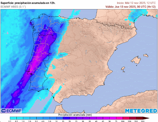 El lento movimiento de la borrasca Claudia y la continua entrada de frentes cargados de humedad movidos por vientos de componente sur-suroeste harán que la fachada occidental de la Península reciba abundantes precipitaciones. En algunos puntos podrían superar los acumulados de 200 l/m2.